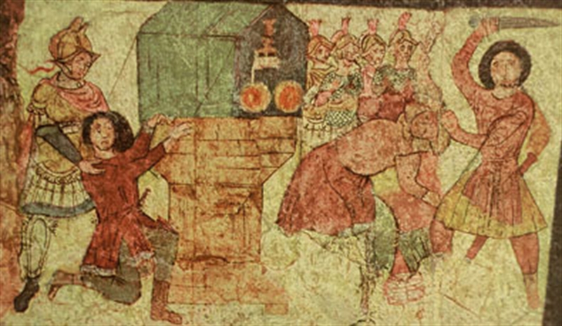 The murder of Zechariah as depicted in the Synagogue of Dura Europos. Image courtesy of Wikimedia Commons.