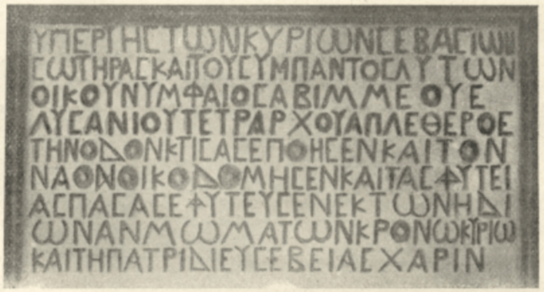 For the safety of the lords Augusti and their whole house; Nymphaeus…freedman of Lysanias the tetrarch, who built the road where there was none and erected the temple and planted all the orchards around it at his own expense for the divine Cronus, lord, and … Eusebia, his wife.[7]}